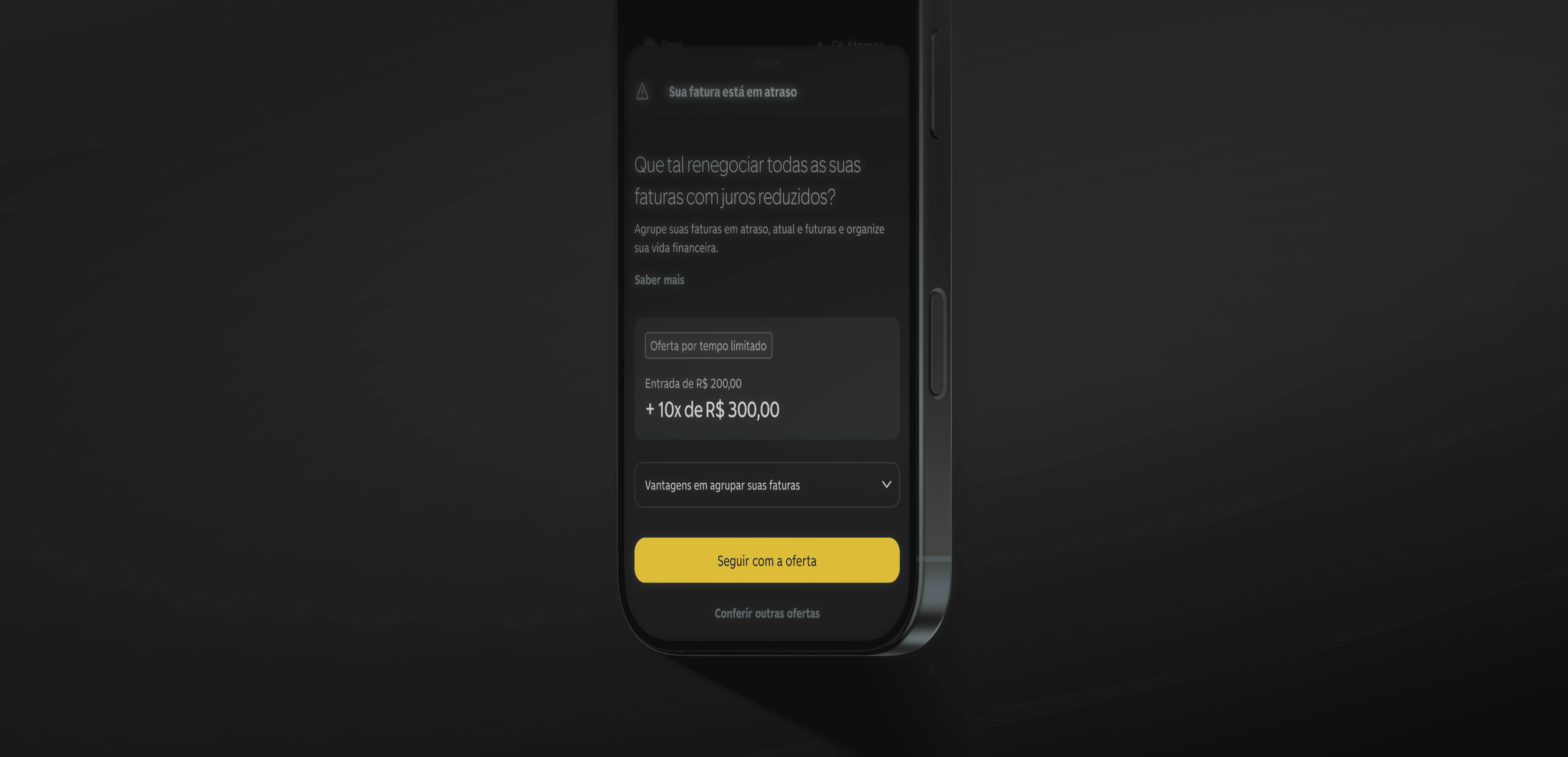 I led the design of a debt recovery experience at C6 Bank aimed at re-engaging delinquent users and increasing revenue recovery through a more human-centered approach. The core challenge was behavioral and systemic: users in debt were abandoning the app, making renegotiation options effectively invisible. Despite having flexible offers such as discounts and installment plans, low financial literacy combined with poor communication design resulted in low engagement and heavy reliance on manual collections.